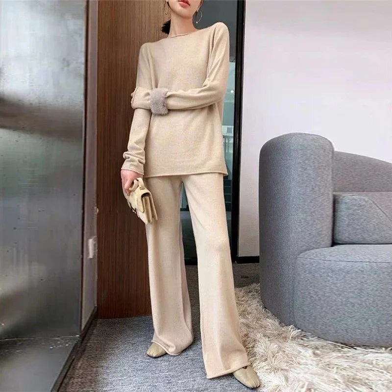 Upgrade your wardrobe with our Chic Cashmere Sweater + Wide Leg Pants Set—where comfort meets style. This luxurious set features a soft cashmere sweater paired with elegant wide-leg pants, offering a perfect blend of cozy and sophisticated. The relaxed fit ensures all-day comfort while maintaining a polished look, making it ideal for both casual outings and elevated occasions. Effortlessly chic and versatile, this set is your go-to for a timeless, fashion-forward ensemble.