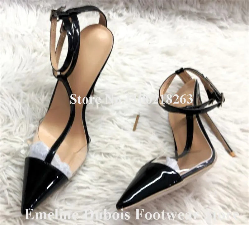 Wine Red PVC Pumps Pointed Toe Clear Transparent Patchwork Stiletto Heels Shoes Pink Green Ankle Straps 12cm High Heels